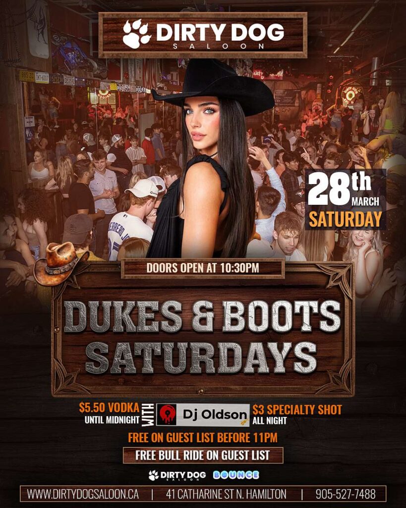 Saddle up for a night on the town inside Dirty Dog Saloon, Downtown Hamilton’s hottest nightlife destination and only country-themed party bar. For over 20 years, our venue has been a staple in the city’s entertainment scene, offering a unique down home experience that sets us apart from the rest. Whether you’re looking to dance to the best in country, rock, and pop music selections, try your luck with our mechanical bull, or simply unwind with friends, DD is the place for you.